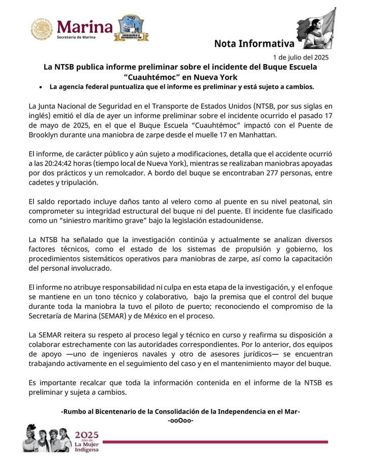 Reporte de la Secretaría de Marina sobre el accidente del buque Cuauhtémoc