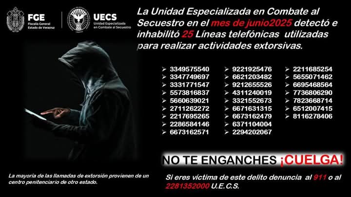 Xalapa, Ver., a 2 de julio del 2025.- La Unidad Especializada en Combate al Secuestro a través del Departamento de Negociación, logró desactivar 16 engaños telefónicos ocurridos durante el mes de junio del 2025 en todo el estado de Veracruz, así como la inhabilitación de 25 líneas telefónicas, las cuales eran ocupadas por los extorsionadores para realizar los engaños telefónicos.