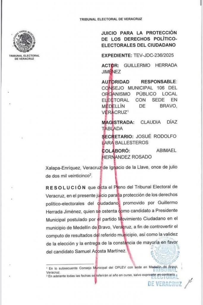 Medellín de Bravo, Ver., 24 de julio de 2025 — El Tribunal Electoral de Veracruz (TEV) resolvió este jueves validar la elección de Samuel Acosta como presidente municipal electo de Medellín de Bravo, desechando por unanimidad la impugnación presentada por el excandidato de Movimiento Ciudadano, Guillermo Herrada.