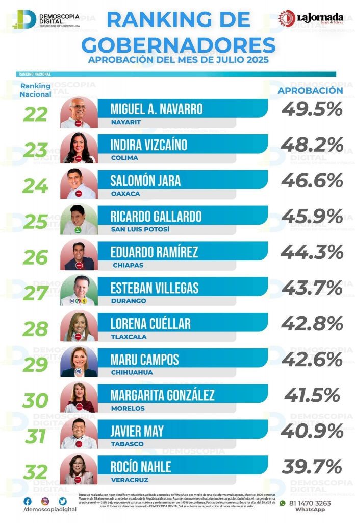 Veracruz ha sido ubicado en el último lugar del ranking de aprobación de gobernadores, con contexto de violencia y crisis política según la encuesta de Demoscopia Digital de julio de 2025, lo que refleja un fuerte retroceso en la popularidad de la gobernadora Rocío Nahle García, quien asumió el cargo en diciembre de 2024.