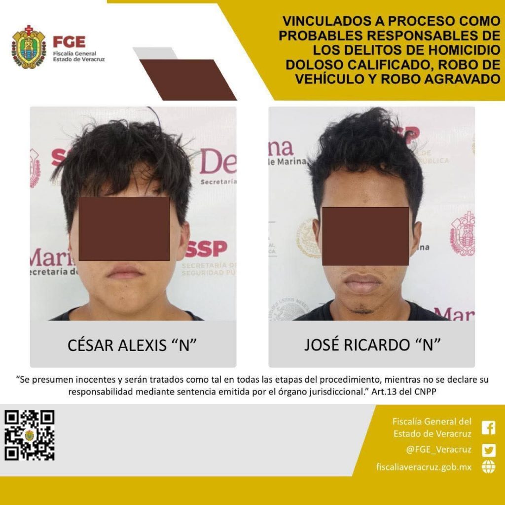 En una acción paralela, la Fiscalía Regional Veracruz obtuvo vinculación a proceso en contra de José Ricardo “N” y César Alexis “N” como probables responsables de los delitos de homicidio doloso calificado, robo de vehículo y robo agravado, en agravio de la misma víctima.