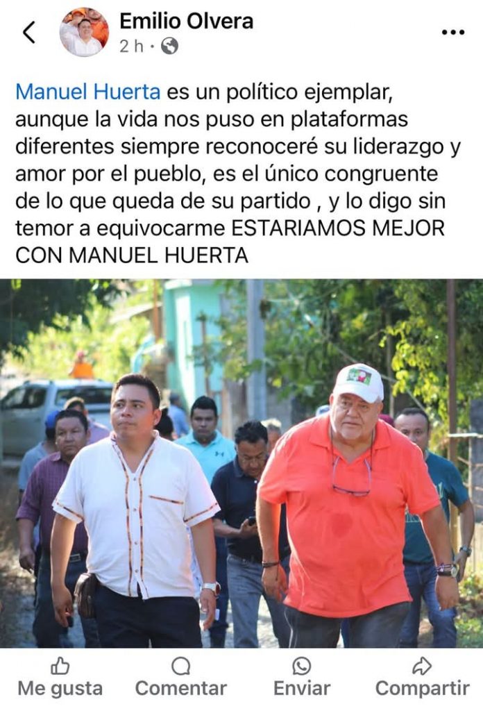 Poza Rica, Ver.- Si ya de por sí en su partido lo miraban como apestado, la gota que derramó el vaso la echó el alcalde electo de Poza Rica, Emilio Olvera, quien a través de sus redes sociales expresó públicamente su reconocimiento al senador Manuel Huerta Ladrón de Guevara.