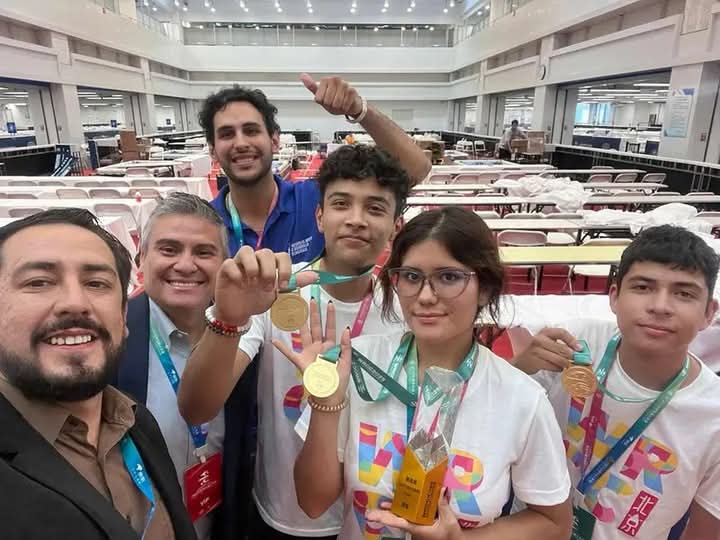 Karina Jaired Castellanos Hernández, Gabriel Enrique Ojeda Carrillo y Luis Fernando Quintana Ríos, así como Joel Hiram López Echavarría (Coach) son los integrantes del equipo mexicano que se colgó la medalla de oro tras participar en el World Robotics Conference 2025.