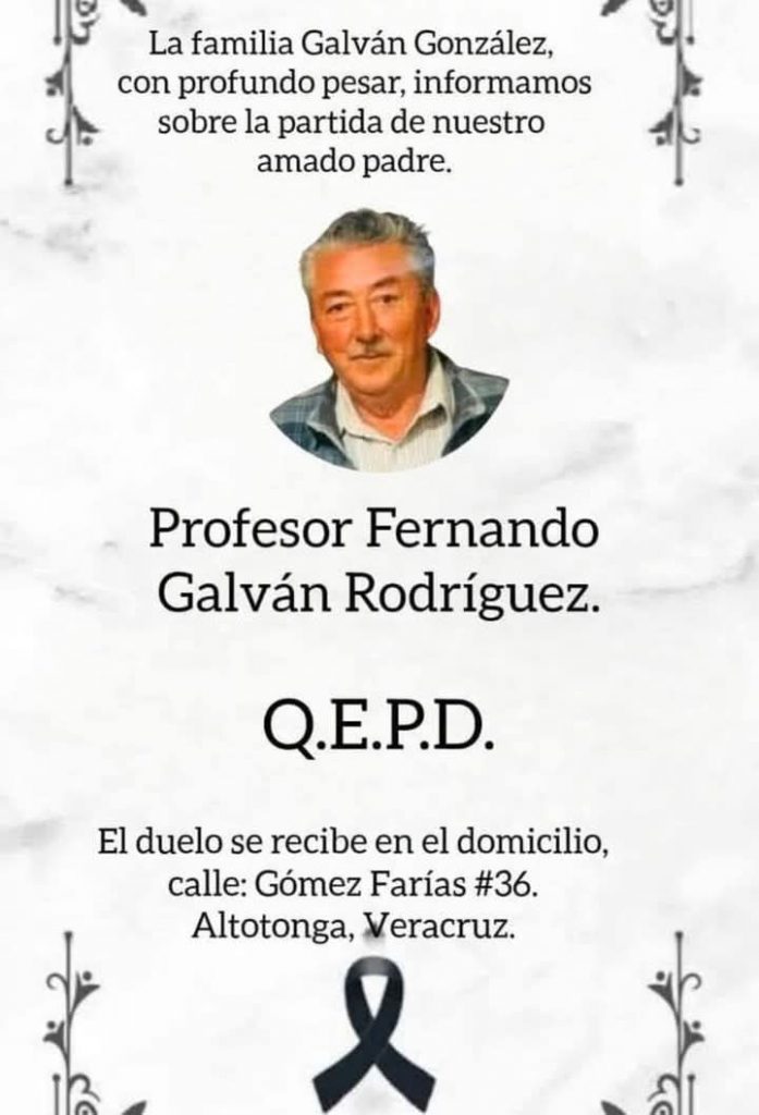 Lamentamos informarle el fallecimiento del profesor Fernando Galván, vecino del municipio de Altotonga, Veracruz, a quien le arrebataron la vida este fin de semana.