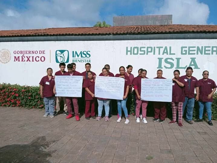 Misma situación ocurrió este día con empleados del Hospital General de #Isla, donde un aproximado de 16 empleados protestaron por la mañana afuera del nosocomio para exigir sus pagos, pues aseguran que desde que llegó la modalidad de IMSS Bienestar, hace casi dos años, están trabajando sin sueldo.