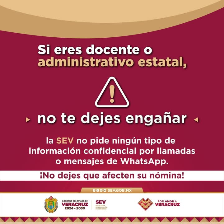 De manera especial, la SEV solicita a las y los trabajadores de la educación no proporcionar información de ningún tipo para que no sean víctimas de algún posible delito, que les afecte en su nómina.