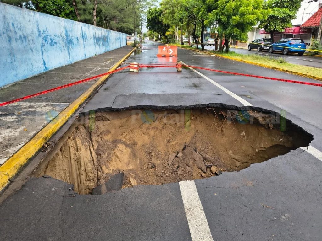 Boca del Río, Ver.- La lluvia de anoche dejó estragos en la zona conurbada, tal fue el caso del enorme socavón que se formó en la calle Mar del Norte esquina con Jesús Reyes Heroles, a unos metros de la Facultad de Educación Física de la Universidad Veracruzana en el fraccionamiento Costa Verde.