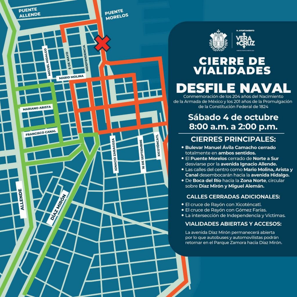 Veracruz, Ver., 1 de octubre de 2025.- El Ayuntamiento de Veracruz, a través de la dirección de Tránsito y Vialidad, informa a la ciudadanía sobre el cierre vial en el centro de la ciudad, este sábado 4 de octubre de 8:00 de la mañana a 2:00 de la tarde, con motivo de la ceremonia y desfile naval que se realizará en la macroplaza del malecón.