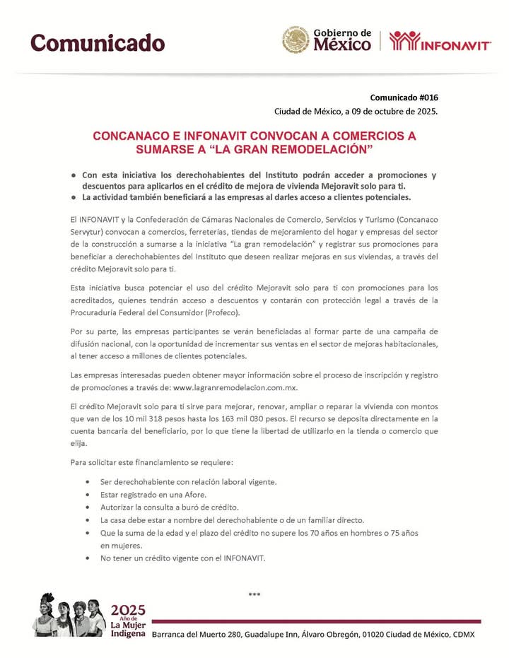 El INFONAVIT y la Confederación de Cámaras Nacionales de Comercio, Servicios y Turismo (Concanaco Servytur) convocan a comercios, ferreterías, tiendas de mejoramiento del hogar y empresas del sector de la construcción a sumarse a la iniciativa “La gran remodelación” y registrar sus promociones para beneficiar a derechohabientes del Instituto que deseen realizar mejoras en sus viviendas, a través del crédito Mejoravit solo para ti.