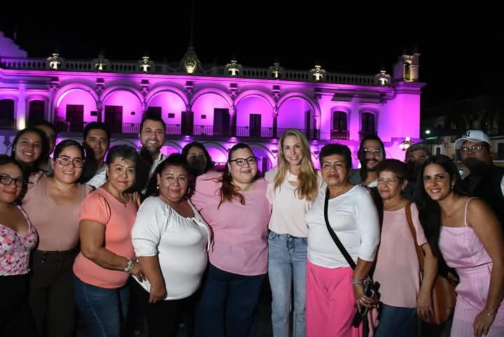 La alcaldesa Paty Lobeira encendió de rosa el palacio municipal de Veracruz en apoyo a la lucha contra el cáncer de mama.