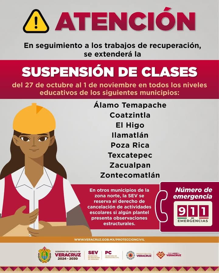 En seguimiento a los trabajos de recuperación, se extenderá la suspensión de clases y actividades escolares para todos los niveles en los siguientes municipios: