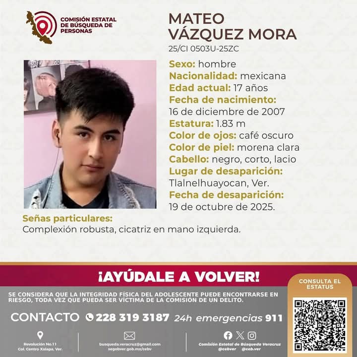 Se han cumplido cinco días de la desaparición de Mateo Vázquez Mora en el municipio de #Tlalnelhuayocan. Mateo tiene 17 años de edad y sus familiares y amigos siguen compartiendo la ficha emitida por la Comisión Estatal de Búsqueda en redes sociales, ya que hasta hoy no hay pistas de él.