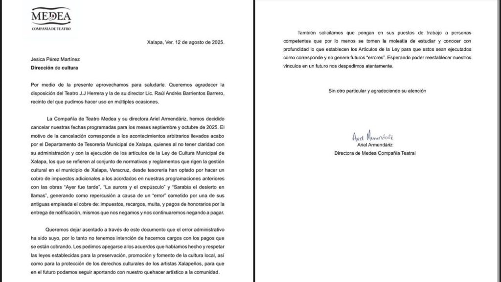 Al notificar la postura ante la cancelación de sus funciones programadas les pidieron realizar un oficio de cancelación para deslindar su responsabilidad ante tal cancelación, oficio que compartieron externando su desagrado.