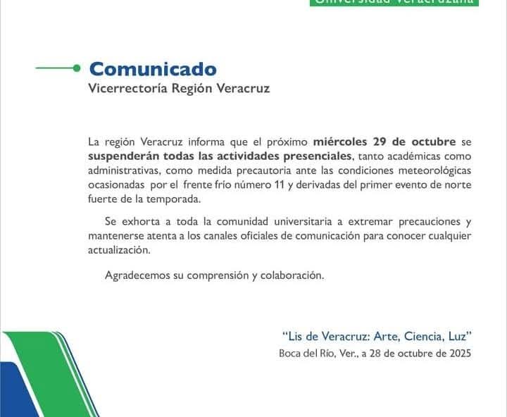 Veracruz, Ver., 28 de octubre 2025.- Debido al ingreso del frente frío número 11 que traerá fuertes rachas de viento para la zona costera del estado, de hasta 100 kilómetros por hora, la región Veracruz-Boca del Río de la Universidad Veracruzana ordenó la suspensión de actividades.