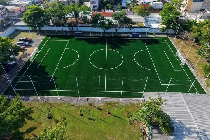 La nueva cancha cuenta con más de mil 800 metros cuadrados de pasto sintético tipo Tufting, resistente a temperaturas extremas, beneficiando directamente a más de 6 mil personas entre alumnos, docentes y padres de familia.