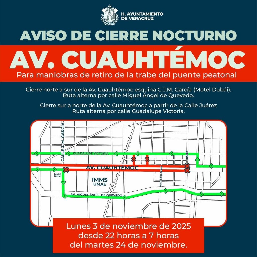 Veracruz, Ver., a 3 de noviembre de 2025.- El H. Ayuntamiento de Veracruz, a través de la dirección de Tránsito y Vialidad Municipal, informa a la ciudadanía que con motivo de los trabajos de colocación de la trabe del puente peatonal del IMAE IMSS Centro Médico Nacional “Adolfo Ruiz Cortines”, se llevará a cabo un cierre nocturno temporal en la avenida Cuauhtémoc.