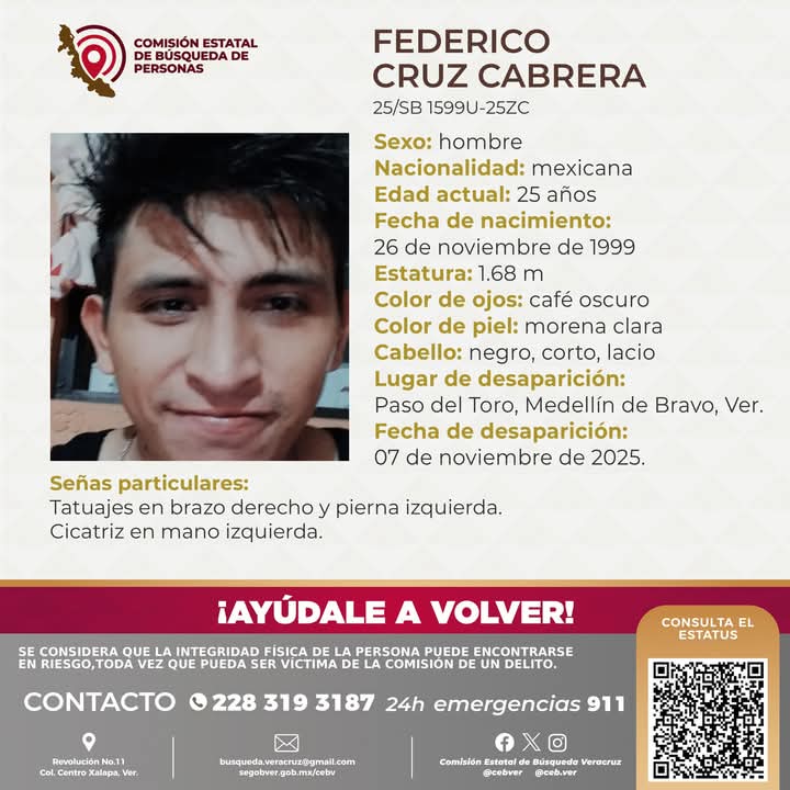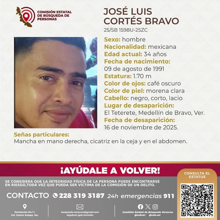 ServicioSocial Solicitamos su colaboración para localizar a José Luis Cortés Bravo, de 34 años de edad, y a Federico Cruz Cabrera, de 25, reportados como desaparecidos el 16 y 7 de noviembre, respectivamente, en el municipio de #MedellínDeBravo. Cualquier información contactar al número y/o correo que aparecen al margen de este boletín.