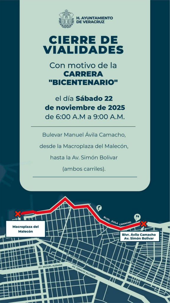 Veracruz, Ver., 21 de noviembre de 2025.- El H. Ayuntamiento de Veracruz, a través de la dirección de Tránsito Municipal, informa a la ciudadanía que el próximo sábado 22 de noviembre, con motivo de la realización de la Carrera “Bicentenario”, el boulevard Manuel Ávila Camacho permanecerá cerrado de 6:00 a.m. a 9:00 a.m.
