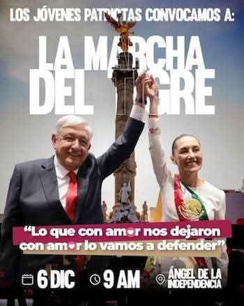 Jóvenes identificados como simpatizantes del partido Morena convocaron, en redes sociales, a la movilización denominada “Marcha del Tigre”, que se llevará a cabo el próximo 6 de diciembre, a las 9:00 horas en el Ángel de la Independencia, con el objetivo de demostrar el respaldo de este sector a la presidenta Claudia Sheinbaum Pardo y defender los logros de la Cuarta Transformación.