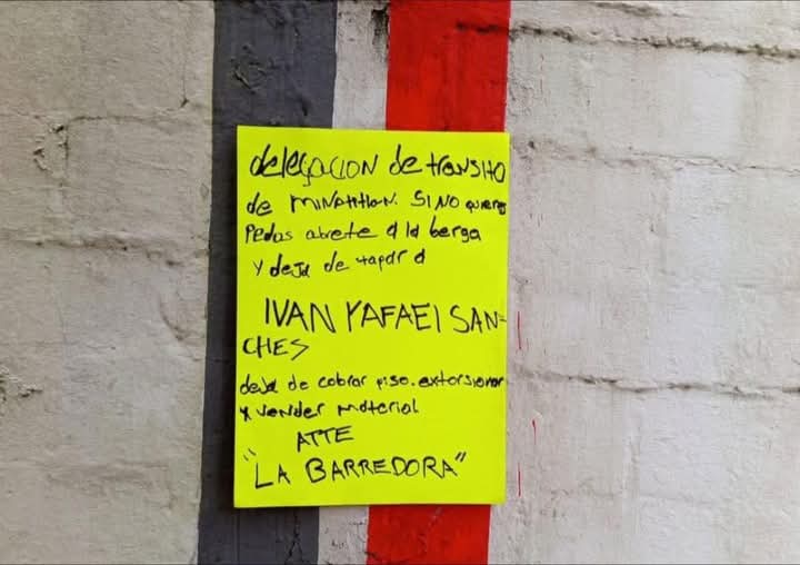 La cartulina contenía un mensaje dirigido a una persona de nombre Iván Rafael Sánchez, señalado presuntamente como trabajador de la delegación de Tránsito del Estado. El mensaje estaba firmado presuntamente por el grupo criminal “La barredora”, aunque no se ha confirmado su autenticidad del mismo.