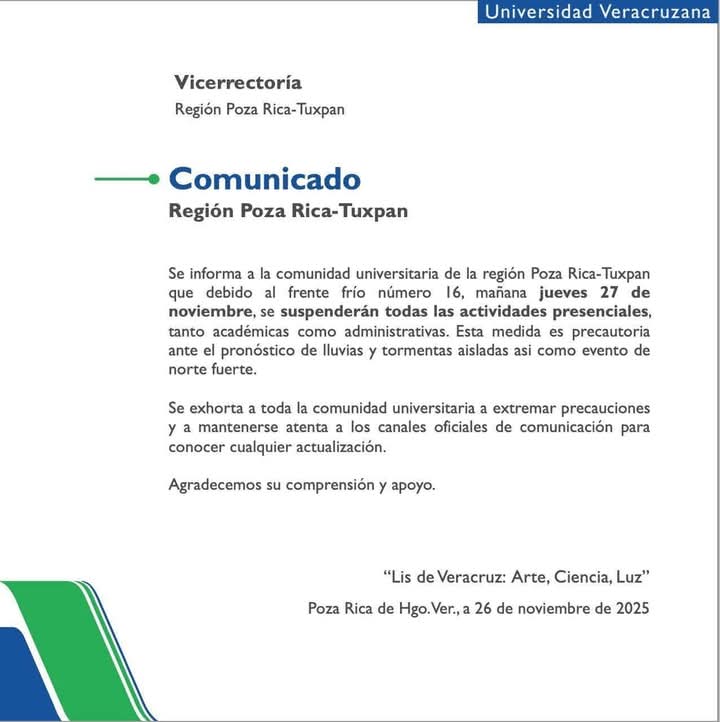 🚨IMPORTANTE 🚨 La #UniversidadVeracruzana informa a la comunidad estudiantil la suspensión de actividades en la región Poza Rica-Tuxpan para este jueves 27 de noviembre. Esto como medida de precautoria por el impacto del #FrenteFrio 16 en la zona norte de la entidad y