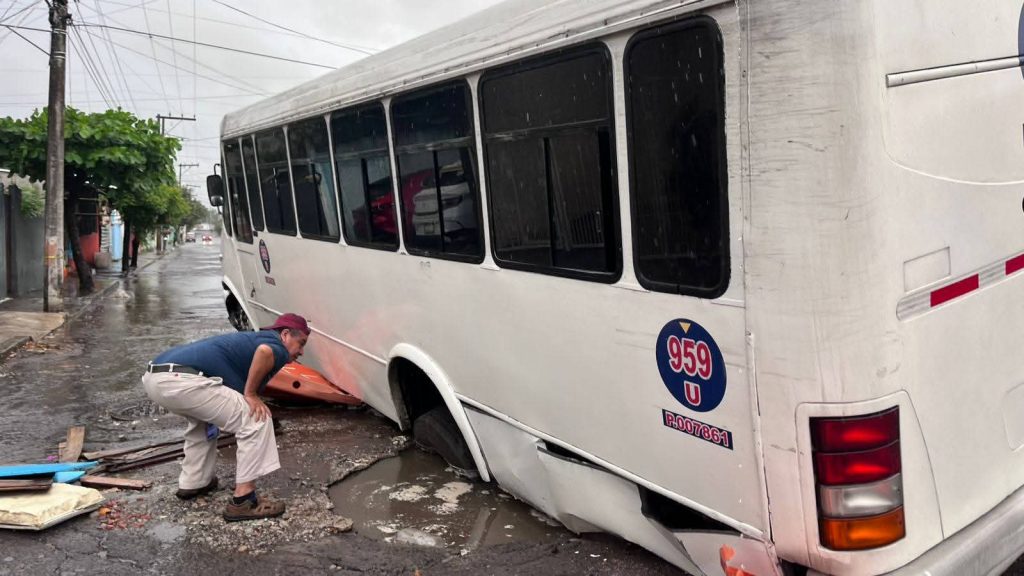 Según el operador, el fuerte aguacero y la calle inundada, no le permitió ver el hoyanco y terminó hundiendose la unidad.