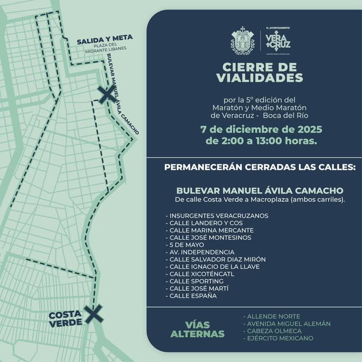 Veracruz, Ver., a 2 de diciembre de 2025.– El H. Ayuntamiento de Veracruz informa a la ciudadanía sobre el cierre del bulevar Manuel Ávila Camacho el domingo 7 de diciembre, con motivo de dos eventos de gran afluencia: la 5.ª edición del Maratón y Medio Maratón Veracruz–Boca del Río y el Tradicional Desfile Navideño 2025.