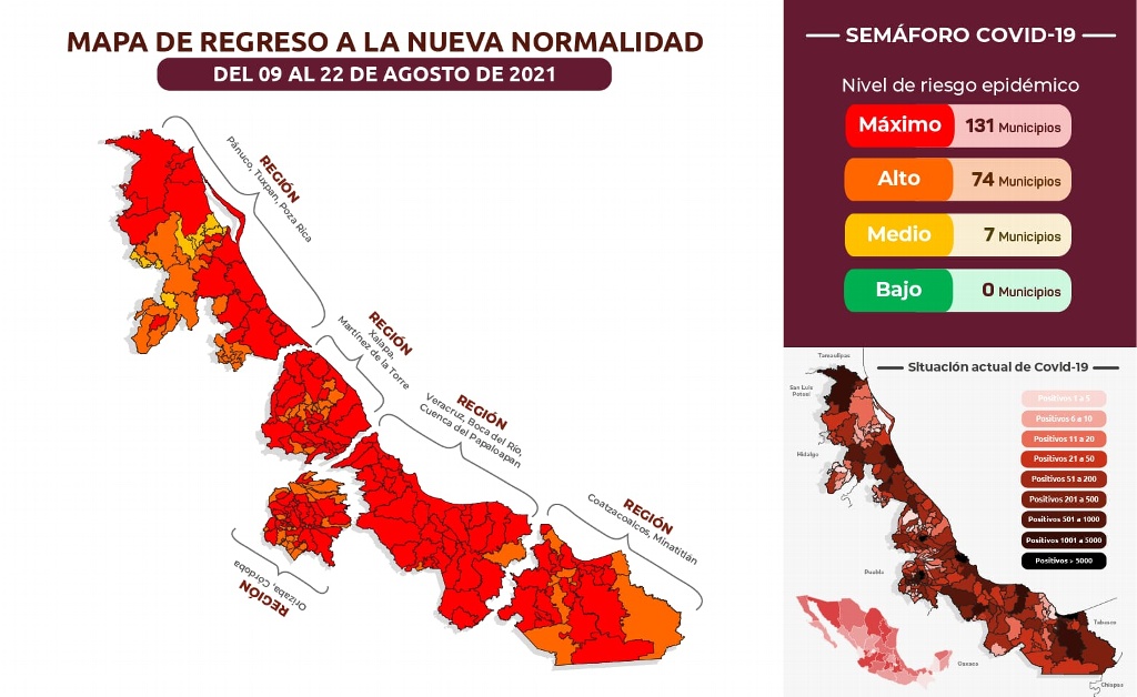La Secretaría de Salud de Veracruz informó que el estado está ubicado en el semáforo epidemiológico a nivel federal, en naranja o riesgo alto hasta en el periodo del lunes 9 al domingo 22 de agosto.