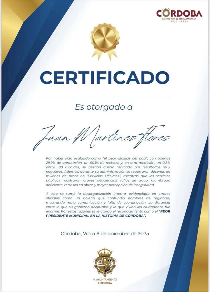 Córdoba, Ver.- De los temas que dieron de qué hablar en el estado, el cuarto informe del alcalde de #Córdoba, Juan Martínez Flores, quien fue exhibido durante el acto protocolario por la regidora séptima, Olga Leticia Liz López, al hacerle entrega de un supuesto certificado impreso como el “Peor presidente municipal en la historia de Córdoba”.