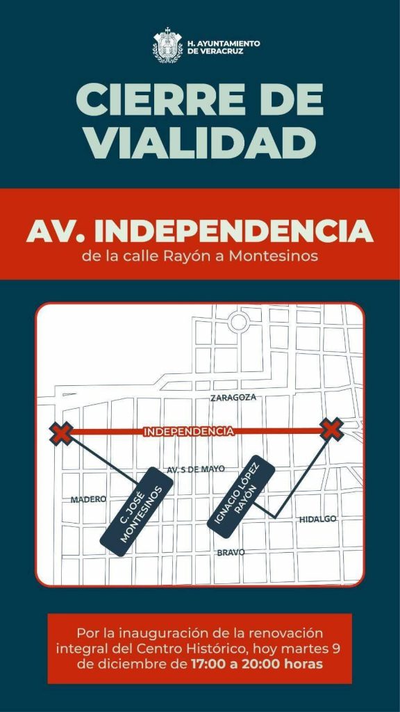 Veracruz, Ver., a 9 de diciembre de 2025.– El H. Ayuntamiento de Veracruz informa a la ciudadanía que, con motivo de la inauguración de la renovación integral del Centro Histórico, permanecerá cerrada la avenida Independencia este día, en el tramo comprendido de la calle Rayón a Montesinos, en un horario de 17:00 a 20:00 horas.