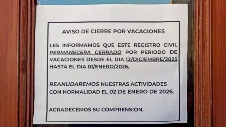 Veracruz, Ver.– El Registro Civil del estado de Veracruz se sumó al periodo vacacional decembrino, por lo que sus oficinas permanecerán cerradas del 12 de diciembre de 2025 al 1 de enero de 2026, según se informó mediante un aviso dirigido a la ciudadanía.