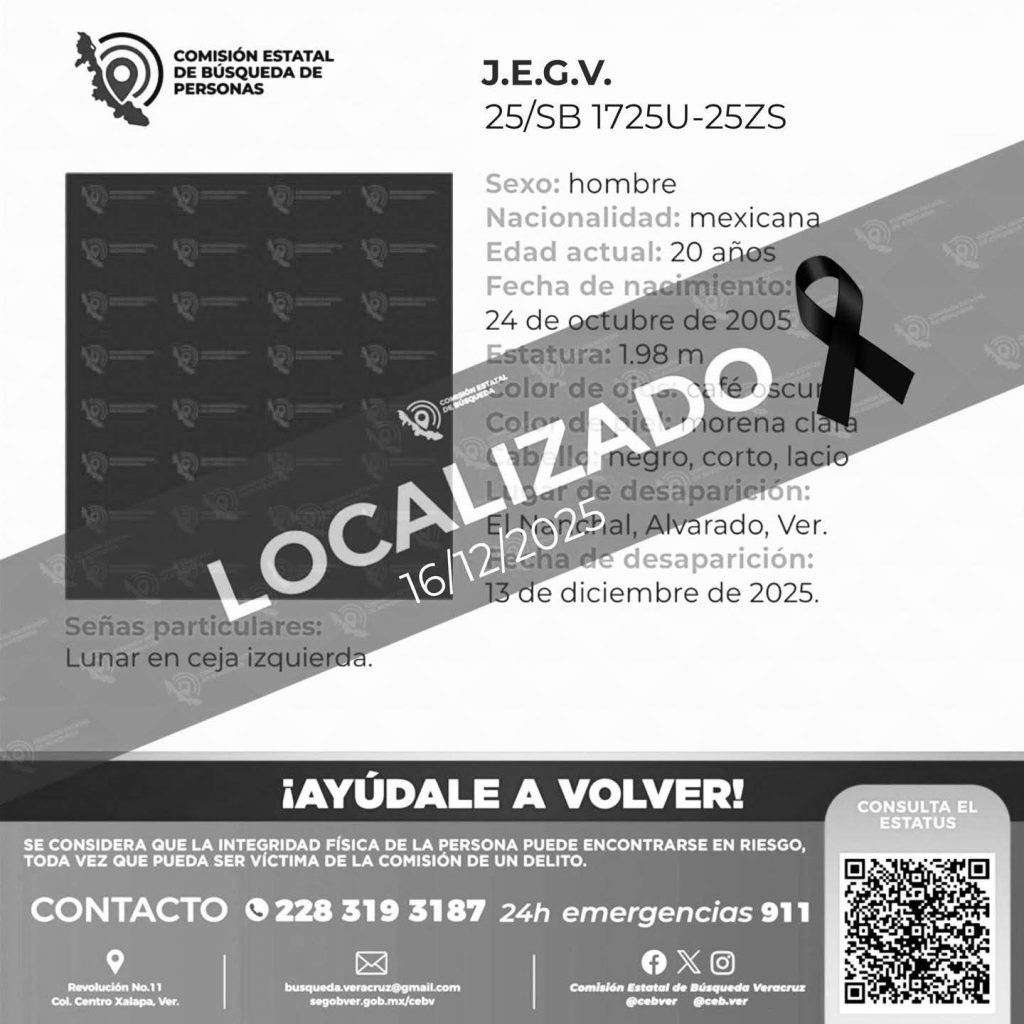 Alvarado, Ver.- Juan Eduardo G. V.,de 20 años de edad, quien fuera reportado como desaparecido el pasado 13 de diciembre en la localidad El Nanchal, perteneciente a este municipio, fue hallado sin vida la tarde de ayer en un terreno baldío de este municipio.