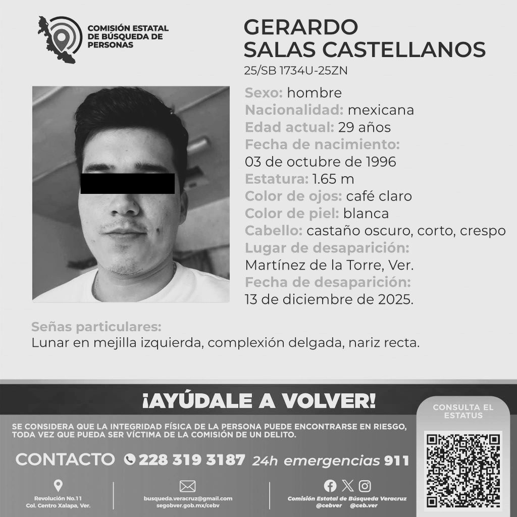 Martínez de la Torre, Ver.- Este miércoles se dio a conocer el hallazgo sin vida del joven Gerardo Salas Castellanos, de 29 años de edad, quien había sido reportado como desaparecido el pasado 13 de diciembre en este municipio.