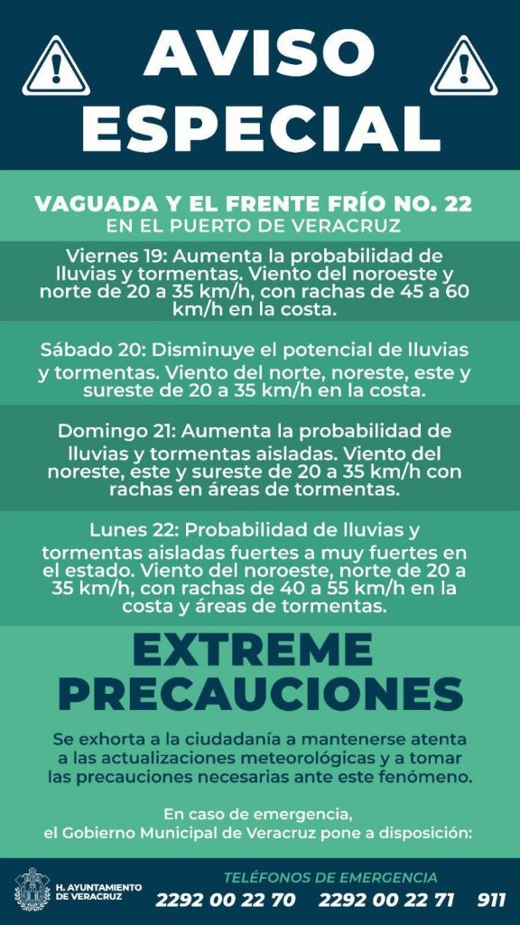 Veracruz, Ver., a 19 de diciembre de 2025.- El Gobierno Municipal de Veracruz, a través de la Unidad de Protección Civil, informa sobre el Aviso Especial ante la interacción de una vaguada establecida sobre el suroeste del Golfo de México y el Frente Frío No. 22, previsto del viernes 19 al lunes 22 de diciembre, con posibles efectos en el Puerto de Veracruz.