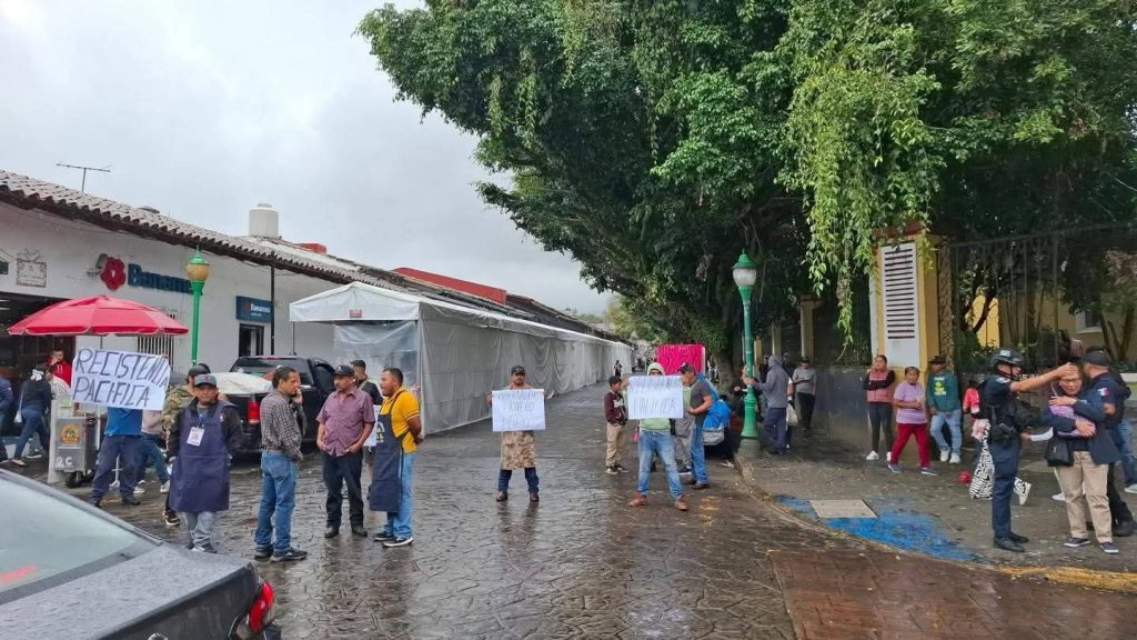 Coatepec, Ver.- Comerciantes informales se manifestaron este martes en el centro y accesos al Pueblo Mágico; protestan por el reciente desalojo pese a que, dicen, muchos tienen permisos autorizados por la actual administración municipal y es por ello que exigen se respete su permanencia. Reportan pérdidas económicas luego de haber sido retirados varios puestos del centro de Coatepec la madrugada y mañana de hoy.