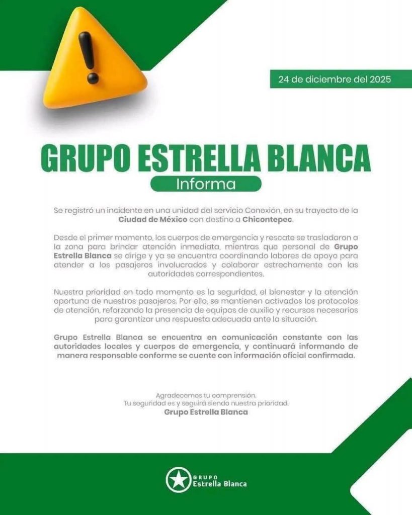 Grupo Estrella Blanca confirma accidente y atención a accidente de autobús en #Zontecomatlán