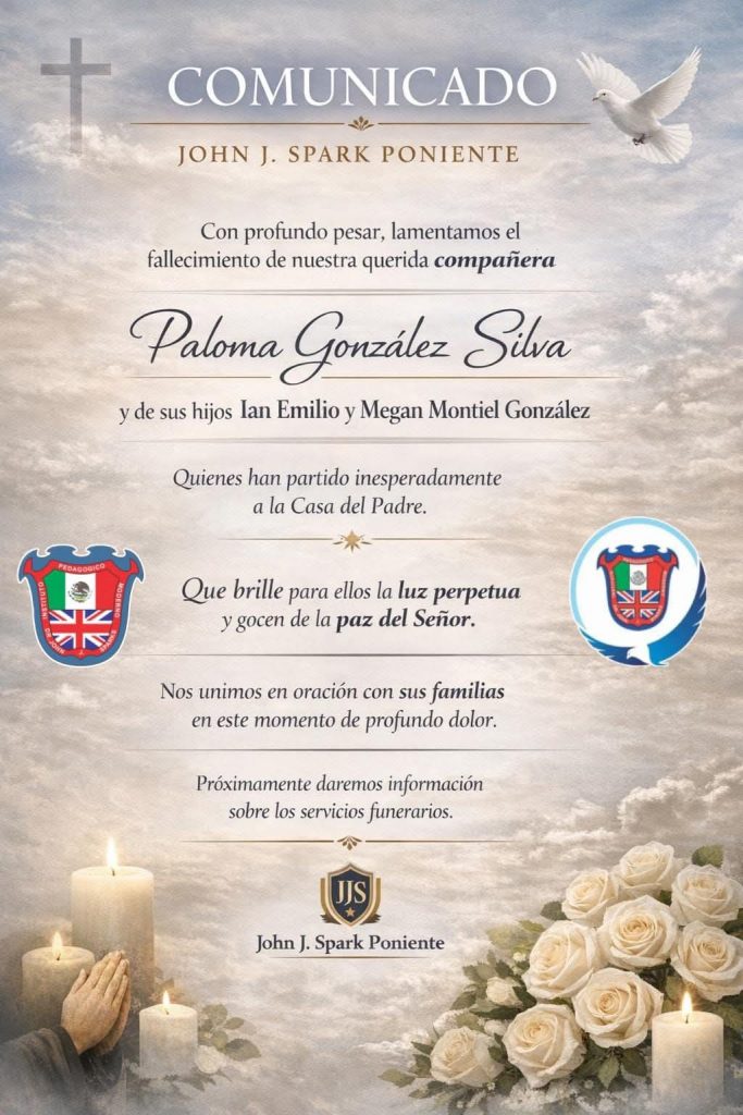 Comunicamos con profundo pesar el sensible fallecimiento de nuestra muy querida amiga y compañera Paloma González Silva, así como de sus amados hijos Ian Emilio y Megan Montiel González, quienes han partido de manera inesperada a la Casa del Padre. 🕊️ 🙏🏻