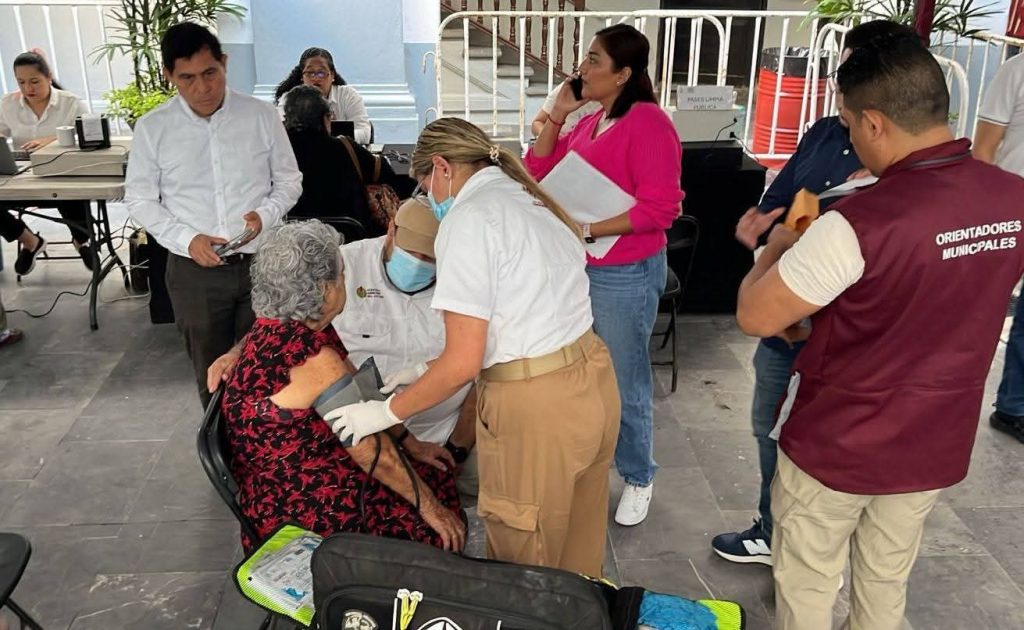 ***Luego de sufrir un aumento en la presión arterial cuando se encontraba en la fila del pago del impuesto predial, la señora de 82 años recibió atención por parte del personal médico del DIF Municipal.