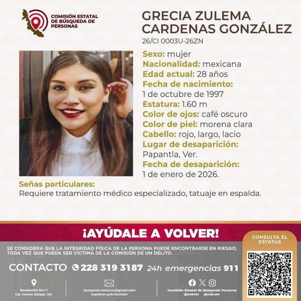 Papantla, Ver.- Continúa la angustia para amigos y familiares de Grecia Zulema Cárdenas González, de 28 años, reportada como desaparecida desde el 01 de enero en este municipio papanteco; Grecia ya había sido reportada desaparecida el 22 de enero de 2023 y dos días después fue encontrada sana y salva.