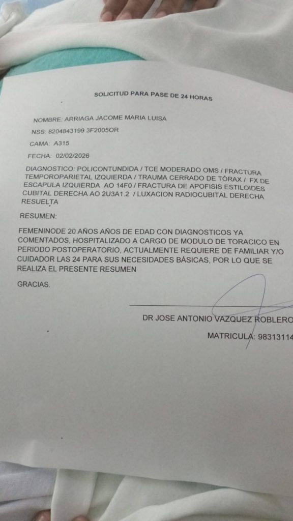 El padre del joven que se encuentra grave, pidió a la Gobernadora del Estado Rocío Nahle, así como a la Fiscal General del Estado de Veracruz Maestra Lisbeth Aurelia Jiménez Aguirre, que los ayuden para aplicar justicia a través del ministerio público, en el caso de los jóvenes que se encuentran graves en un accidente donde la responsabilidad civil recae en el Hospital D María y la aseguradora Quálitas, quién es pese a que existe una carpeta de investigación y tomaron conocimiento todas las autoridades, no quieren hacerse responsables del daño que han ocasionado.