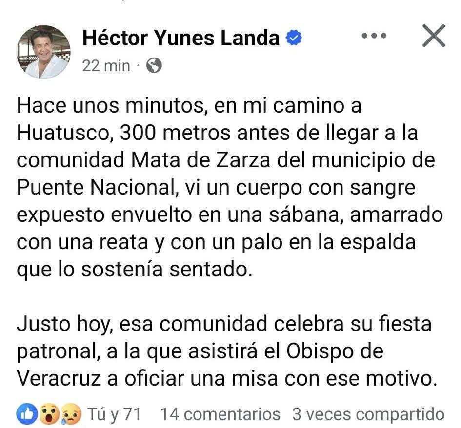 Diputado local en el Estado de Veracruz, Héctor Yunes Landa, dio a conocer la mañana de este jueves a través de sus redes sociales el hallazgo de un ensabanado, así lo escribió👇🏿: