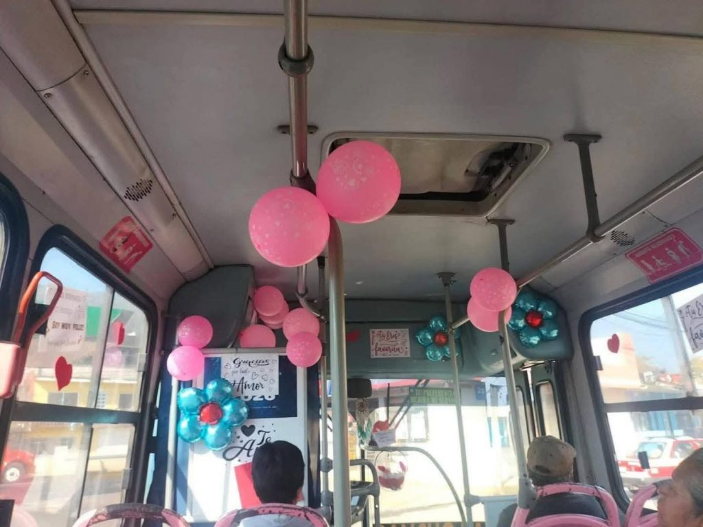 Con globos, letreros agradables y paletas de cortesía, así recibió el chofer a sus pasajeros. No faltó el que se sonrojara con el detallazo ¡Se vale, es día del amor y la amistad!