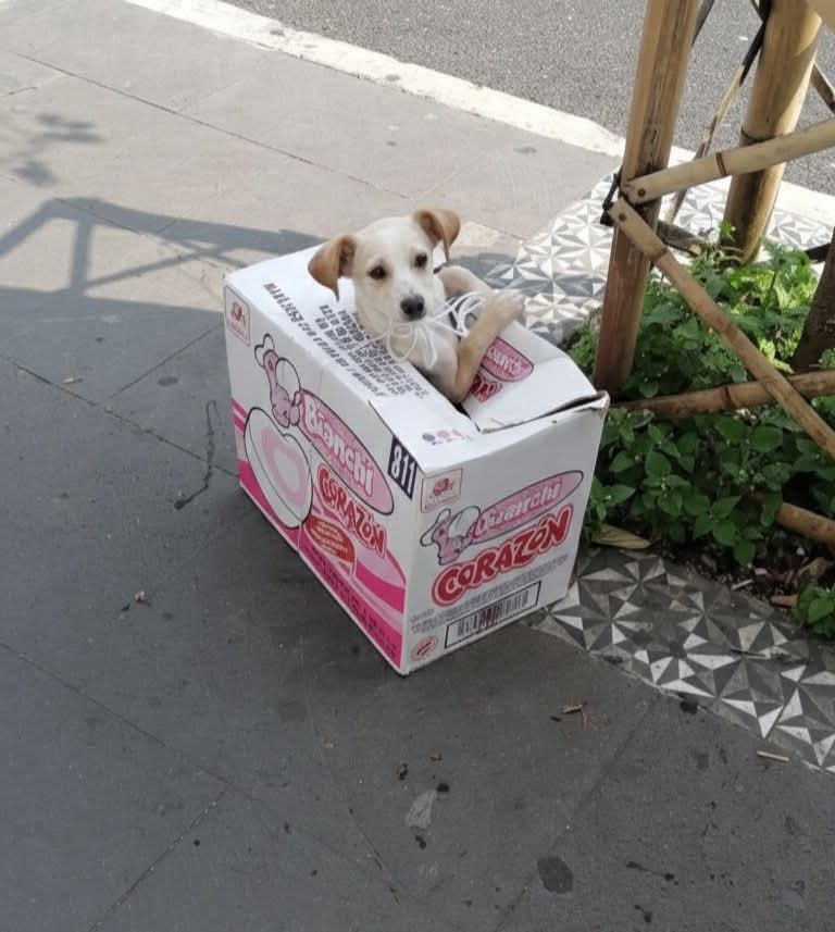 El perrito, un mestizo güerito y con la mirada triste, esperaba asomado de la caja de bombones, esperando a que alguien se apiadara de él y lo rescatara. Hasta el momento se desconoce quién tuvo el corazón para dejarlo en ese lugar.