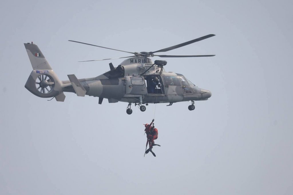 Este ejercicio consistió en la recreación de una situación de emergencia en la mar, para lo cual, se emplearon un helicóptero, una embarcación tipo Defender y cuatro nadadores de rescate de esta Institución, mismos que, realizaron ejercicios de inserción al agua, mediante salto de caída libre desde la aeronave.