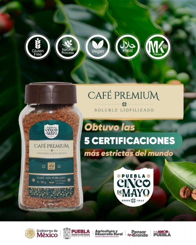 Con el nacimiento de la marca poblana de Café Soluble “Cinco de Mayo”, el Gobierno de Puebla reafirma su compromiso de fortalecer el desarrollo económico de la cafeticultura mediante acciones que promueven el valor agregado y abren nuevas oportunidades para las y los cafeticultores de la entidad, de la mano de la presidenta Claudia Sheinbaum Pardo. Se trata de un producto orgullosamente poblano: de esta tierra para México y de México para el mundo.