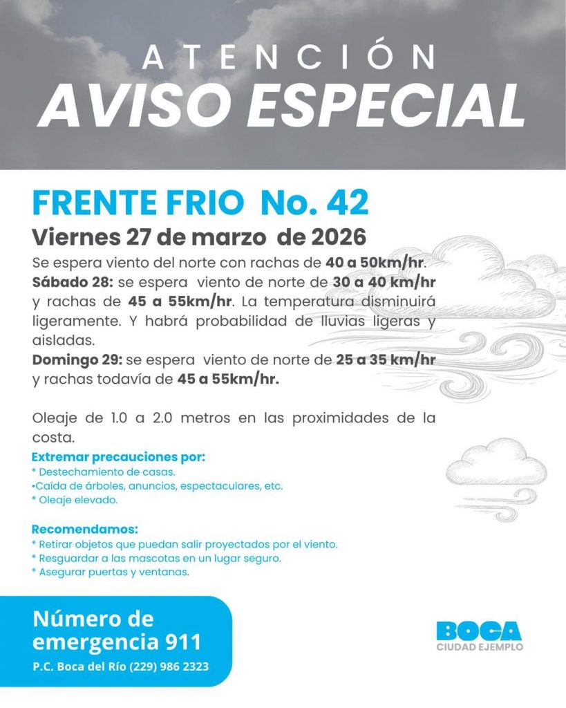 Ante la llegada del Frente Frío No. 42, que se espera entre hoy y las próximas horas, en Boca del Río nos mantenemos atentos y en coordinación para proteger a las familias.