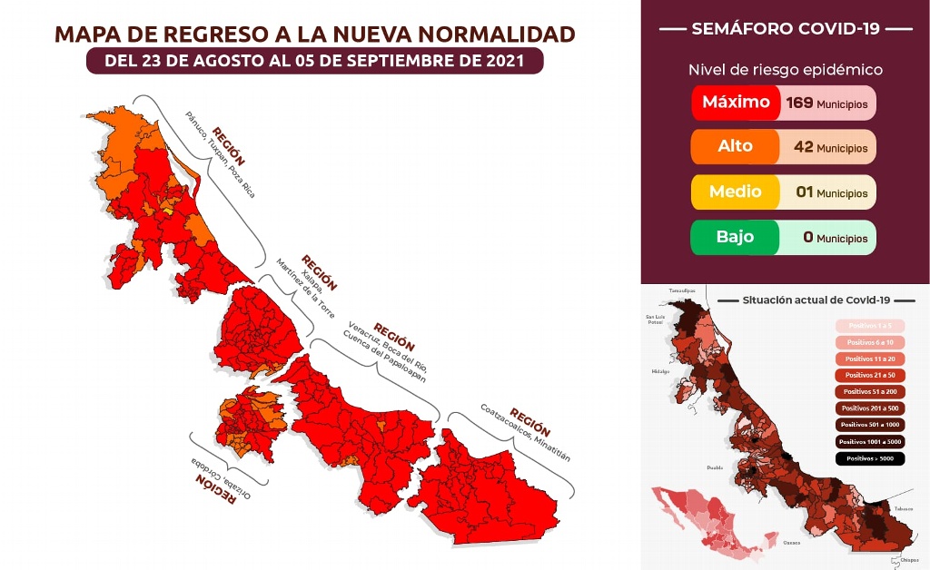 La Secretaría de Salud de Veracruz informó que en el semáforo epidemiológico a nivel federal el Estado de Veracruz está en el color naranja o riesgo alto durante el periodo del lunes 23 de agosto al domingo 5 de septiembre.