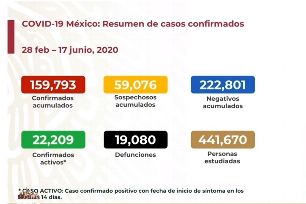 De acuerdo con el reporte presentado este 17 de junio, en México hay 159 mil 793 casos acumulados desde el inicio de la pandemia en el país; mientras que los casos activos son 22 mil 209.