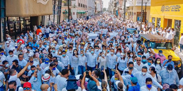 Veracruz, Ver.- Más de 20 mil veracruzanos participaron en la marcha pacífica “Por la Libertad de Veracruz” por la avenida de Independencia hasta llegar al zócalo del Puerto de Veracruz, en donde Miguel Ángel Yunes Márquez y su esposa Paty Lobeira de Yunes asistieron como ciudadanos, sumándose a una sola voz: “¡Todos somos Miguel!”, defendiendo la democracia y la libertad de Veracruz en las próximas elecciones.