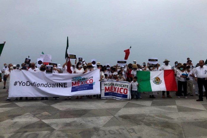 Integrantes del movimiento Misión Rescate México se reunieron en la plaza de la Soberanía del boulevard Manuel Ávila Camacho para manifestar su rechazo a la revocación de mandato que impulsa el presidente de la República Andrés Manuel López Obrador y que se realizará el próximo 10 de abril.